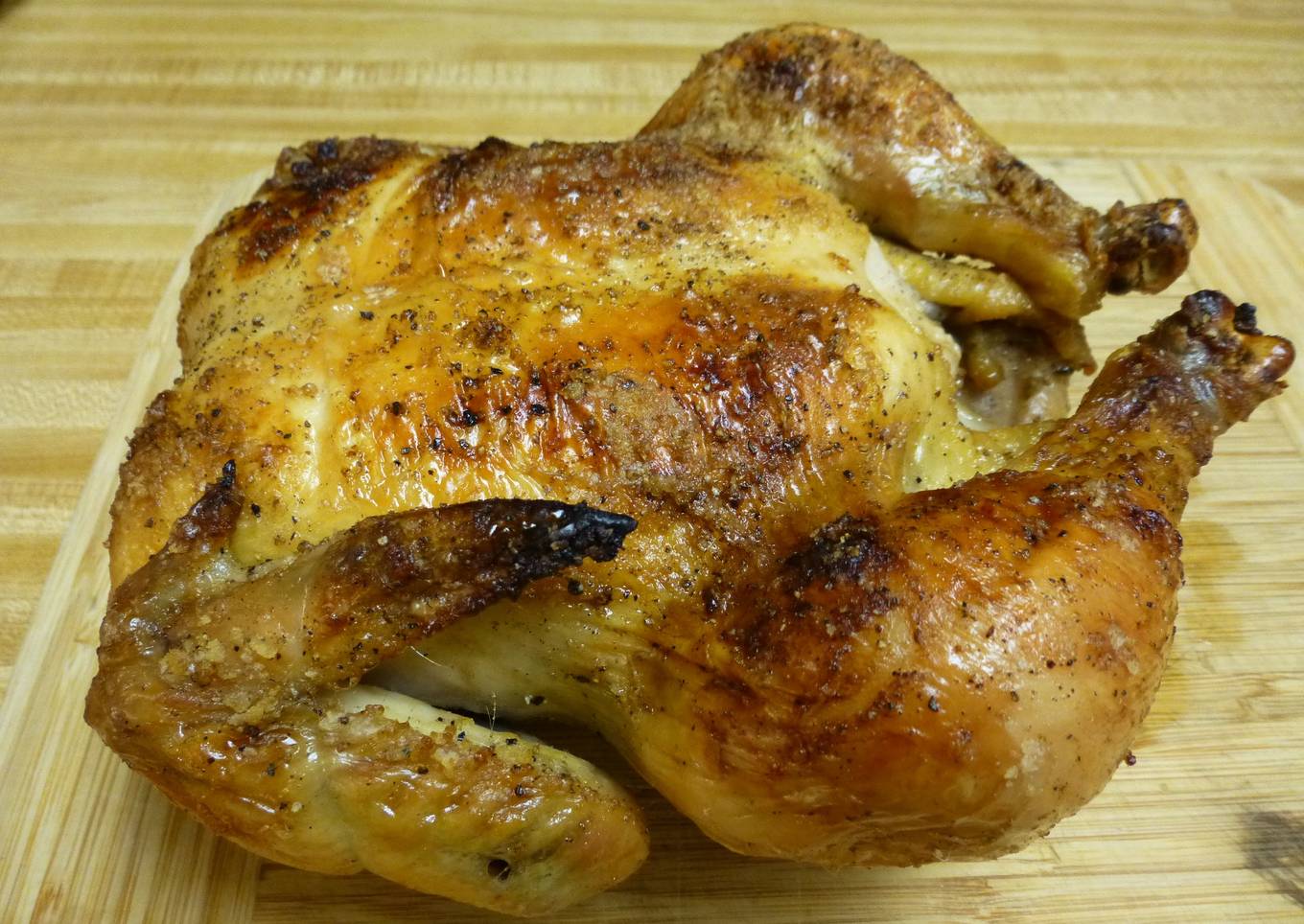 - When chicken is done, remove and let rest uncovered for at least 20 minutes. If you cover with foil, your crispy skin is a soggy mess..Cut up as desired and enjoy.